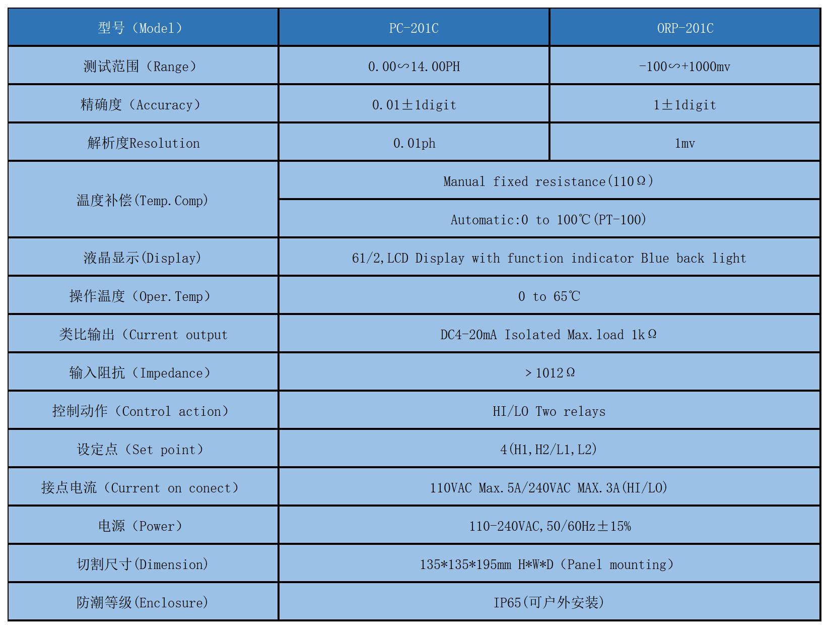 微電腦,單晶片處理,同時(shí)顯示(PH,℃)或(mV,℃)。